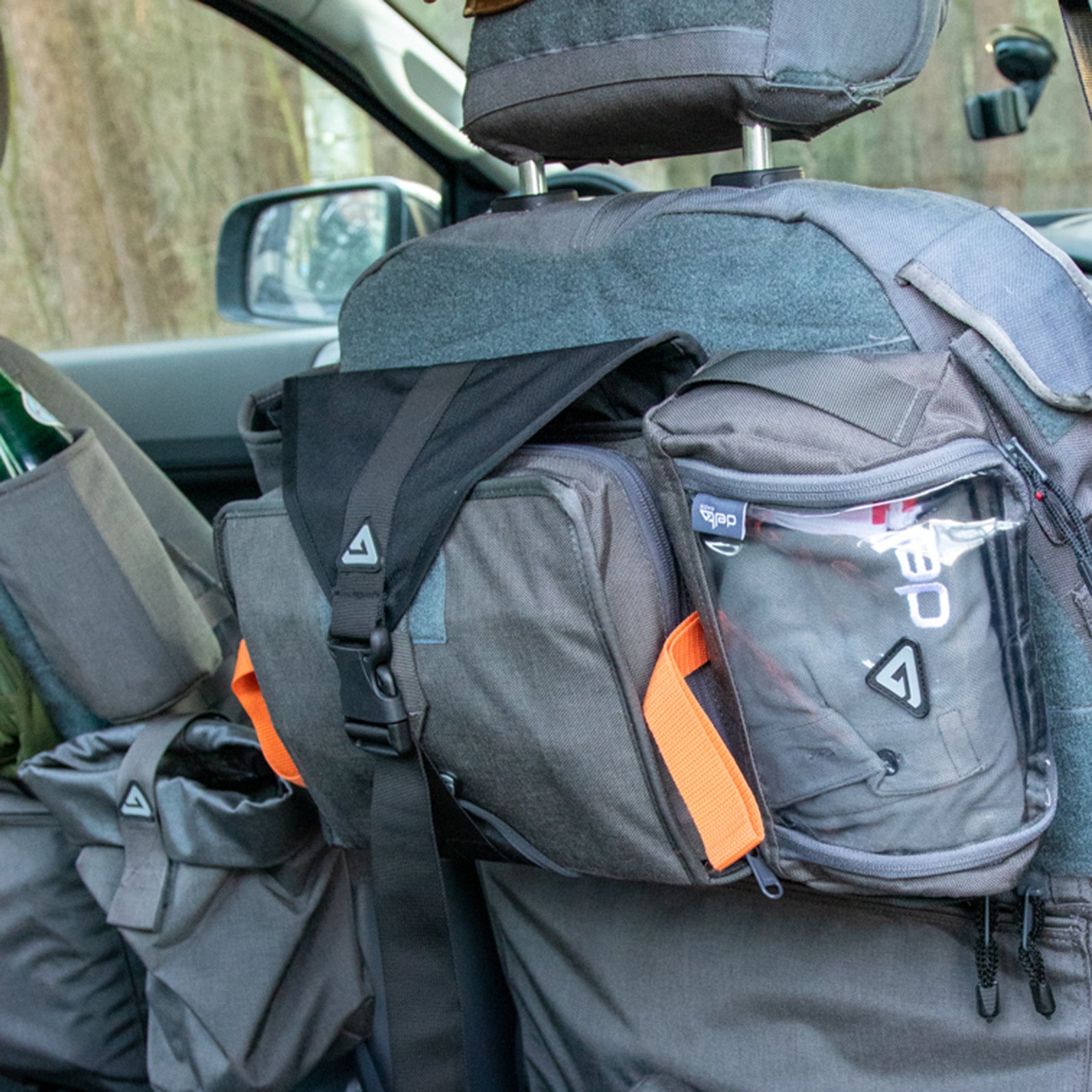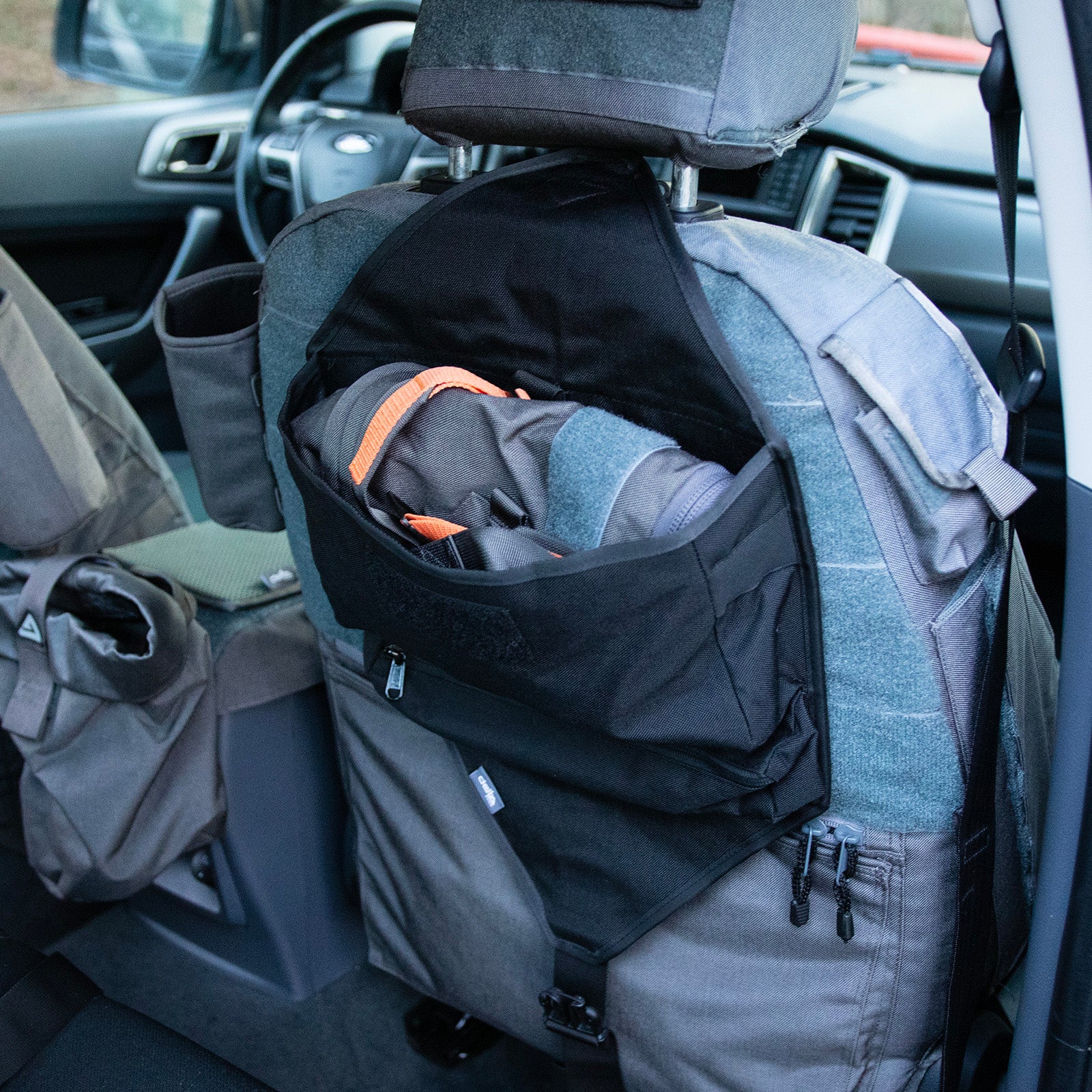 Mit der großen Klettfläche oder dem TYRS (Molle) Adapter kann der Vehicle Holder griffbereit im Fahrzeug befestigt werden. Ideal zur Befestigung des Sponge Bag Sets ist die Klettfläche der Rückenlehne an den Seat Covern.