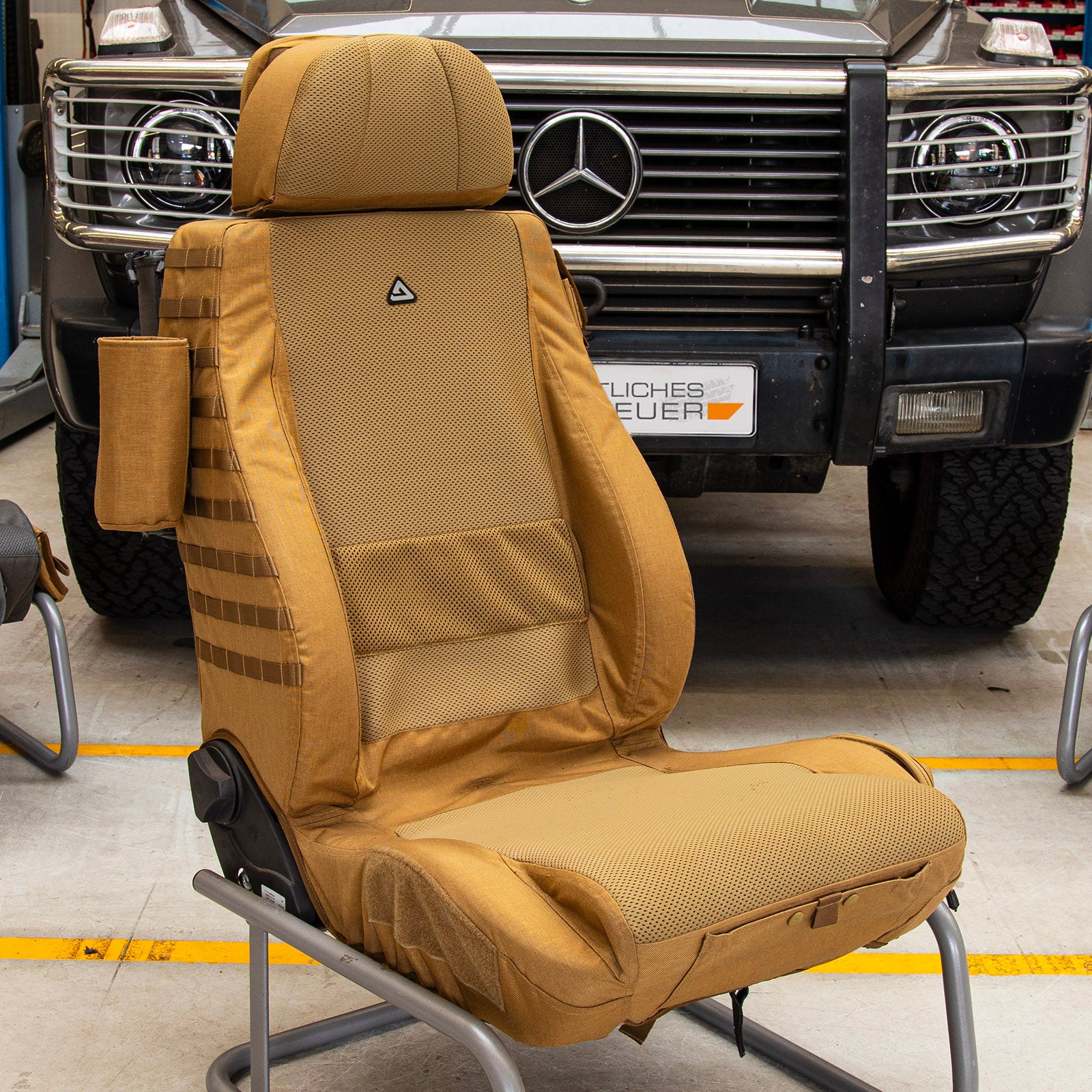 An den Seiten der Sitzfläche sowie an der Front lassen sich Kletttaschen aus unserem Utility,- Klett- und Voyager Bags Programm befestigen. Die Rückenlehne ist an den Seiten mit unserem TYRS (Molle) System ausgerüstet. Die Rückenfläche ist auf der Oberseite ebenfalls mit Klett zur Befestigung von Taschen ausgerüstet. Im unteren Teil befindet sich eine große geräumige Einstecktasche und dahinter eine ebenso große RV-Tasche.
