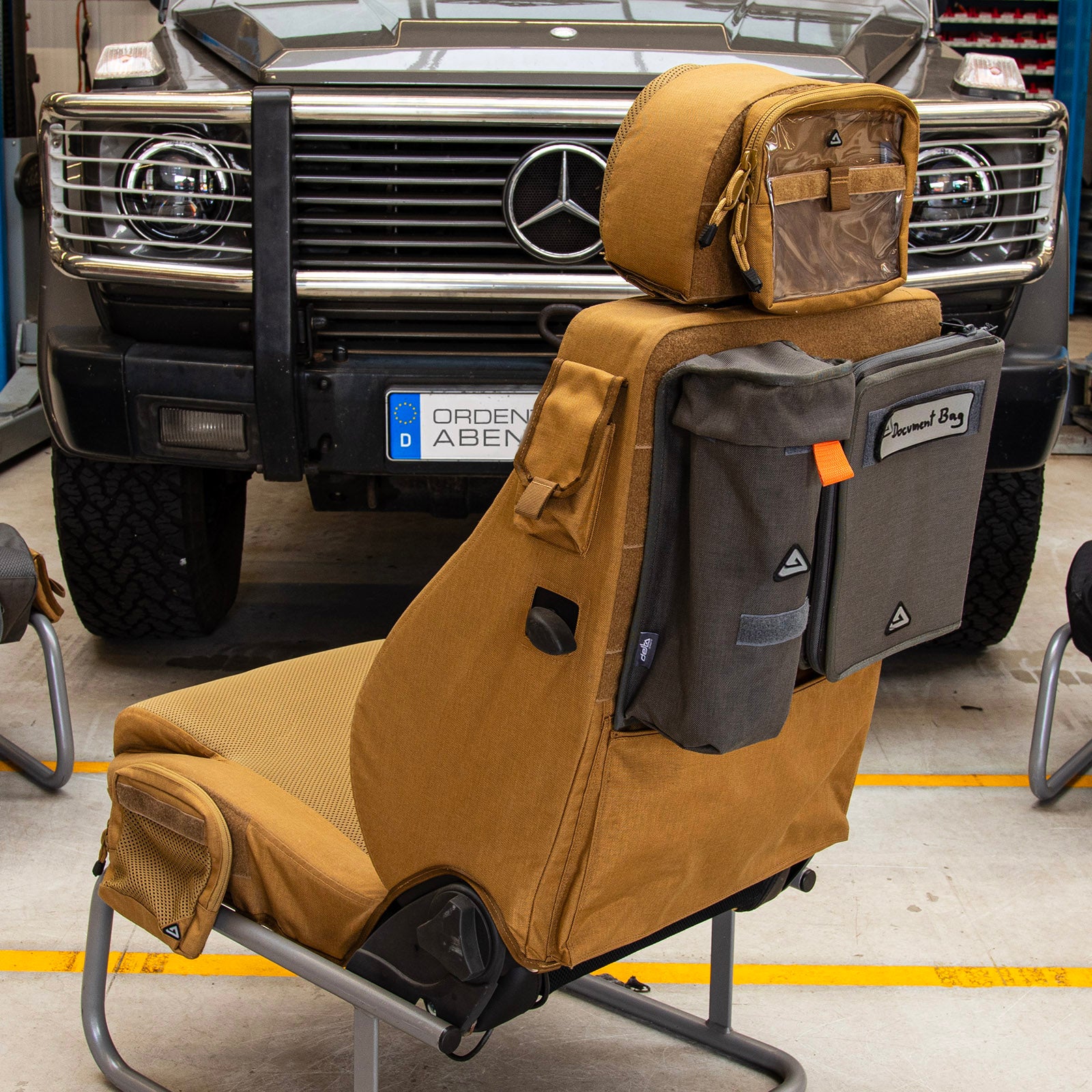 Auch der Kopfstützenbezug ist auf der Rückseite mit Klett zur Taschenbefestigung ausgestattet. So sind Messer, Camera, Taschenlampe, Batterien, Ausweispapiere u.v.m. stets griffbereit.
