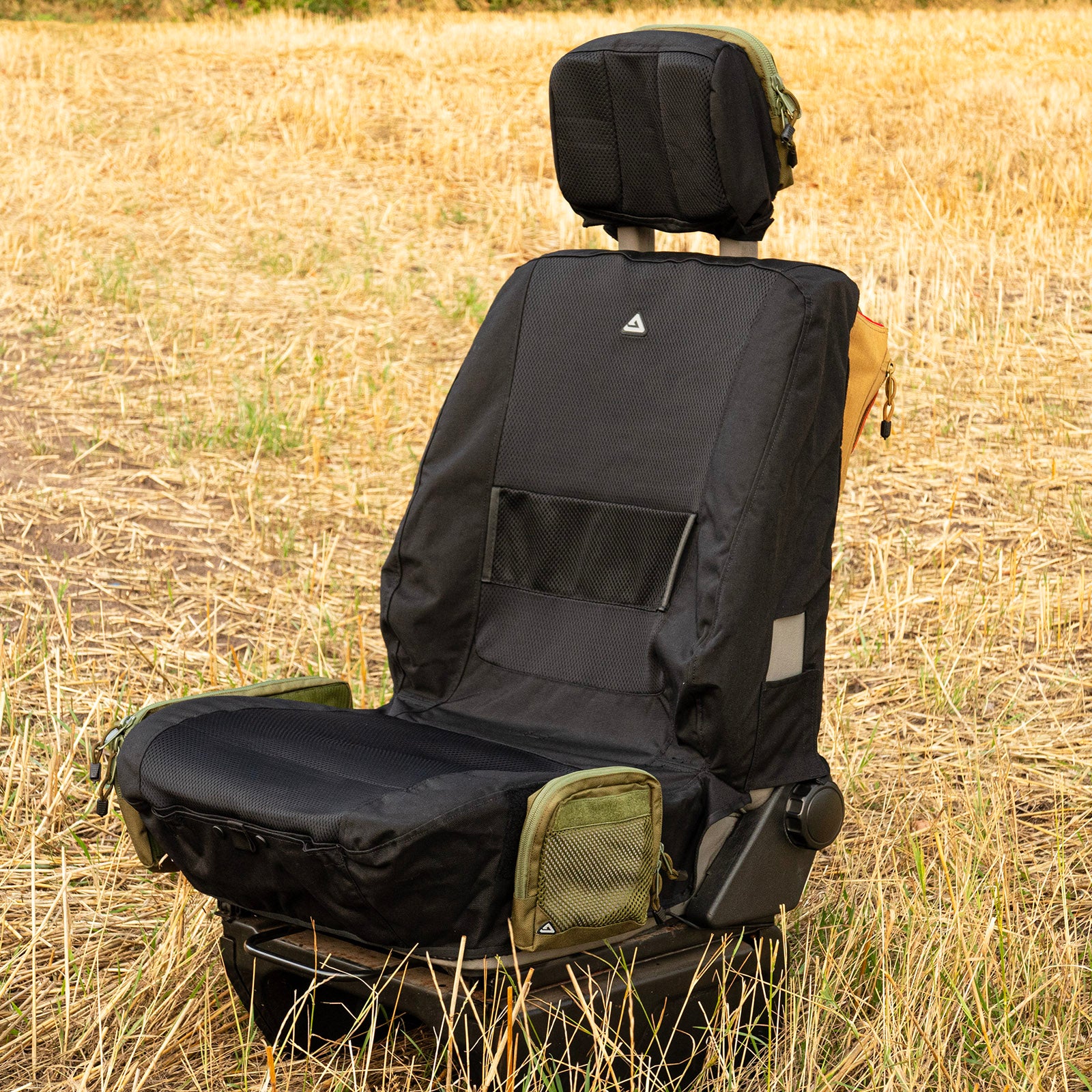 Auch der Kopfstützenbezug ist auf der Rückseite mit Klett zur Taschenbefestigung ausgestattet. So sind Messer, Camera, Taschenlampe, Batterien, Ausweispapiere u.v.m. stets griffbereit.