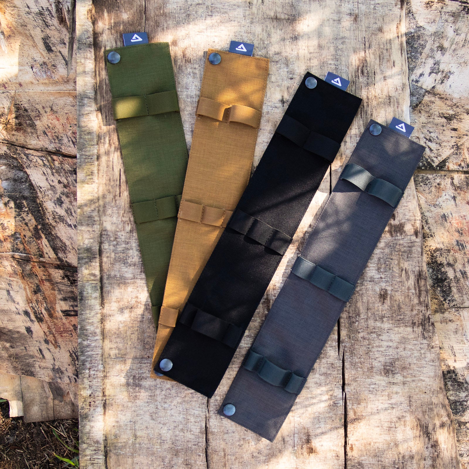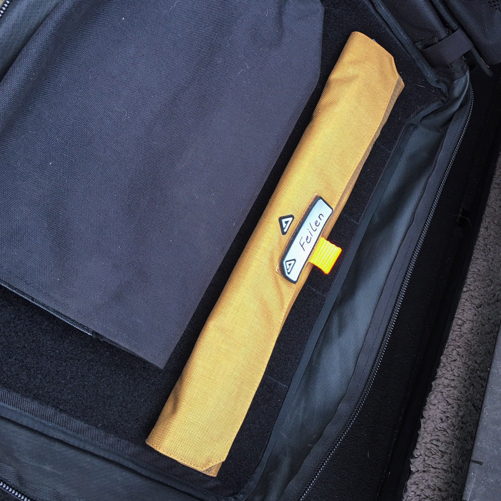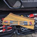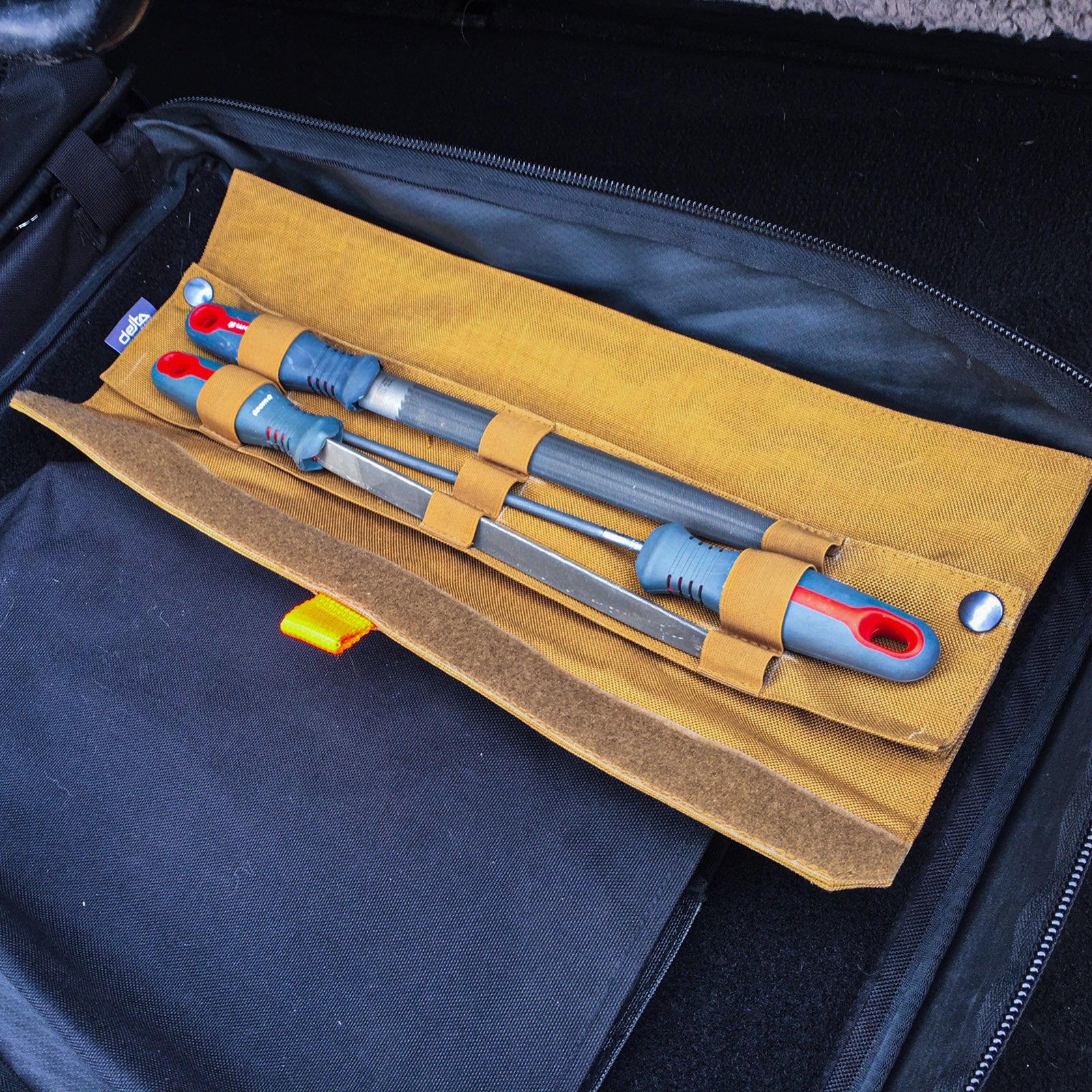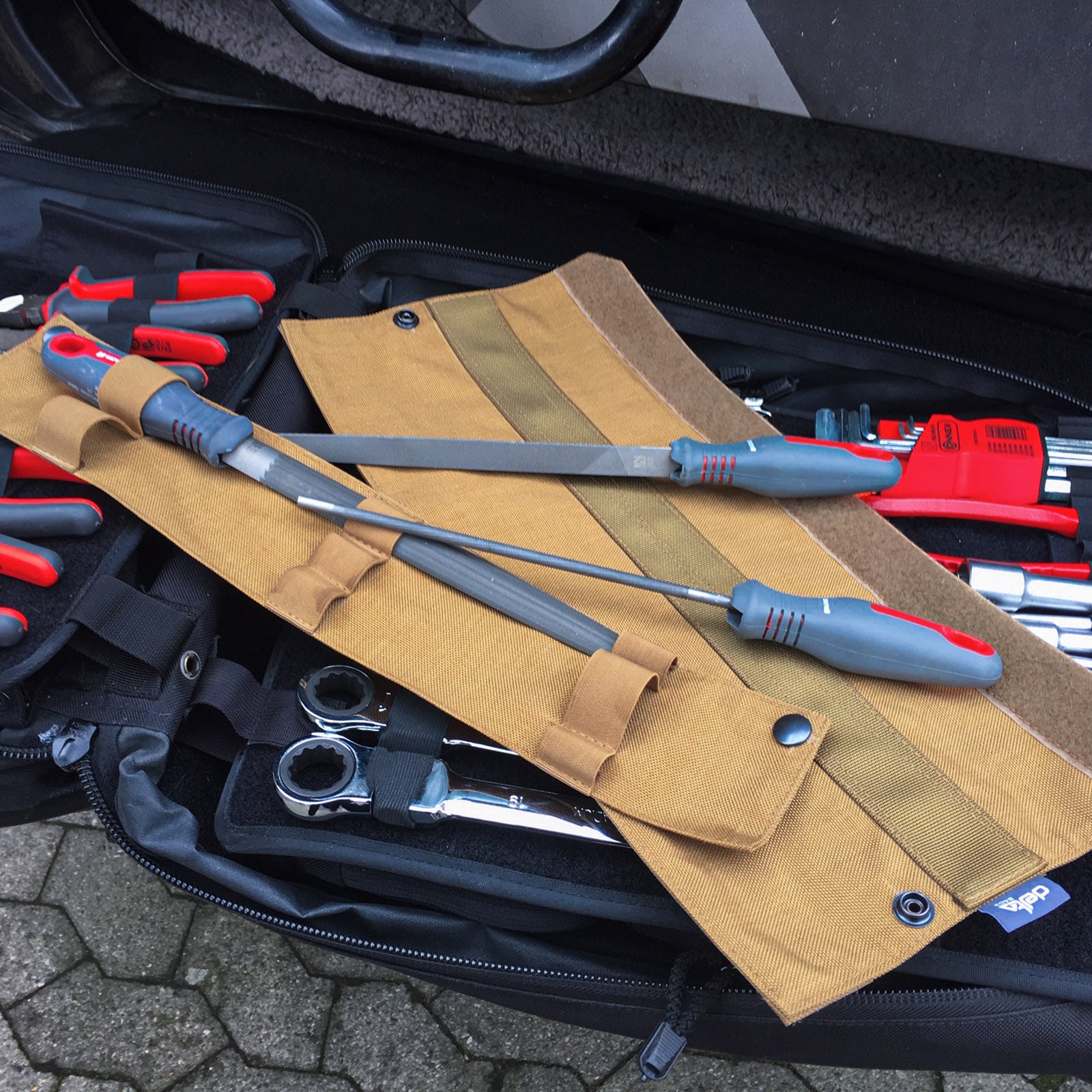 Mit den auf der Grundfläche des File Inlay eingesetzten Druckknöpfen erfolgt die Befestigung am Tool Nut Holder long. Auf der Oberfläche sind drei Reihen von Gummischlaufen aufgenäht. Diese ermöglichen durch Ihre Flexibilität das sichere Befestigen von unterschiedlichen Werkzeugen. Speziell Feilen können so vor Fett und Dreck geschützt werden.