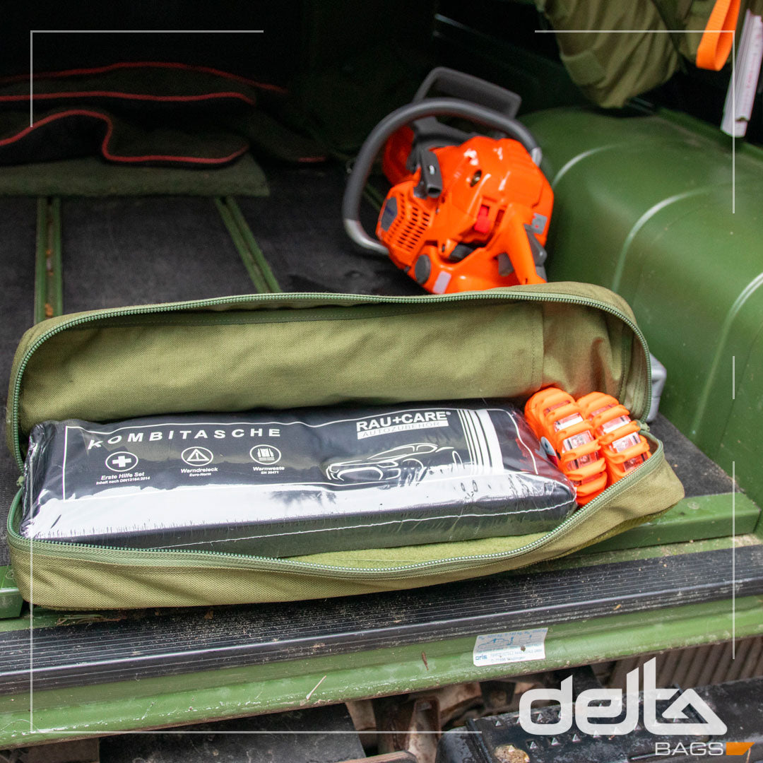 No matter if first aid is needed or a breakdown happened: The TS Bag holds the first aid kit, warning triangle, reflective vests, and a small set of tools.