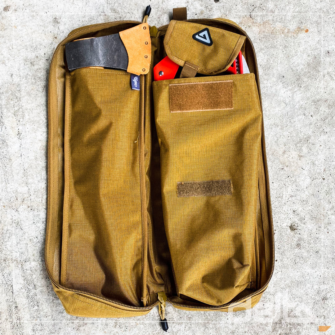 The TS Bag can be mounted to the Seat Cover, Inside Panel, and, using the TYRS (Molle) adapter, to the Inside Cage. A rescue blanket, disposable gloves, chalk, duct tape, and fuses can be transported in a Velcro Bag, fixed to the loop fastener strap on the Inside.