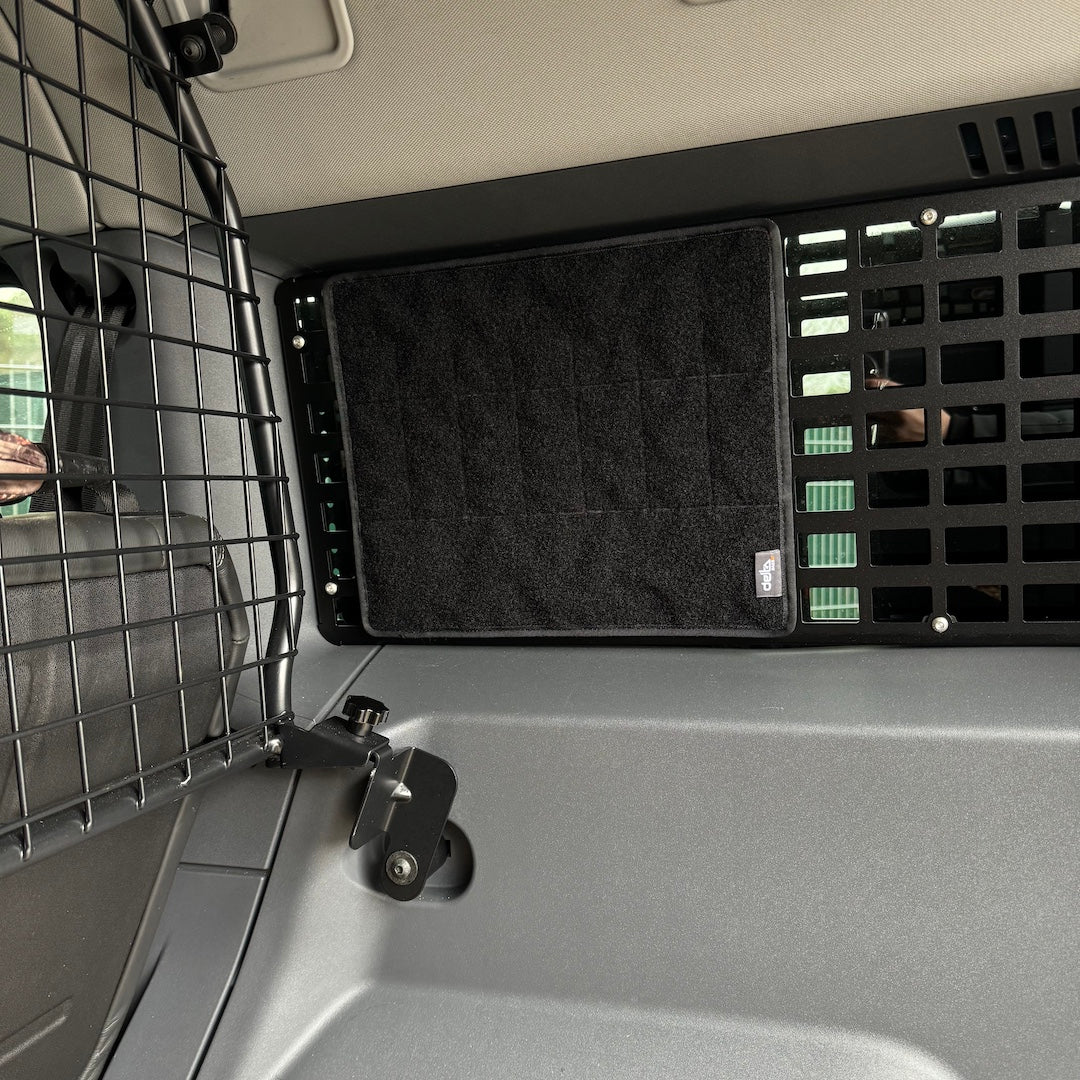 Dieser Klettadapter lässt sich einfach an die M.O.L.L.E. Panels für die Scheiben in den Seitenfenstern des INEOS Grenadier Laderaums einschlaufen und bietet mit der Flauschfläche die einfache Befestigung der delta BAGS.