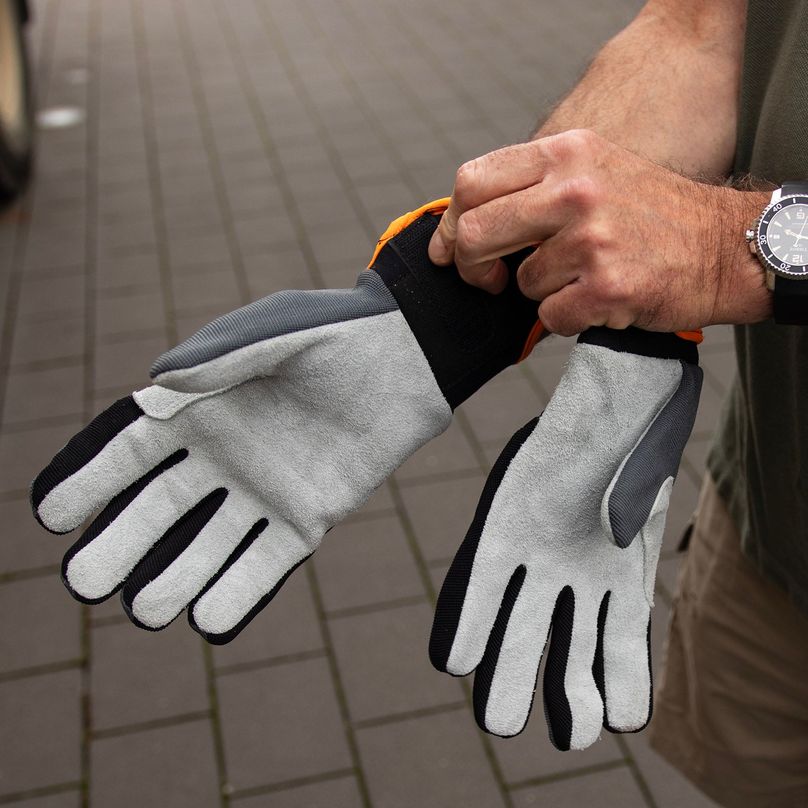 The inside is made of sturdy leather, with reinforced index finger and thumb. The back of the hand is made of nylon with a black neoprene insert and orange piping. The inner lining is made of nylon fleece and nylon fiberglass. The cuff is made of black neoprene and has a Velcro fastener. In addition, a fastening eyelet is used to attach the gloves to an off-road jacket.