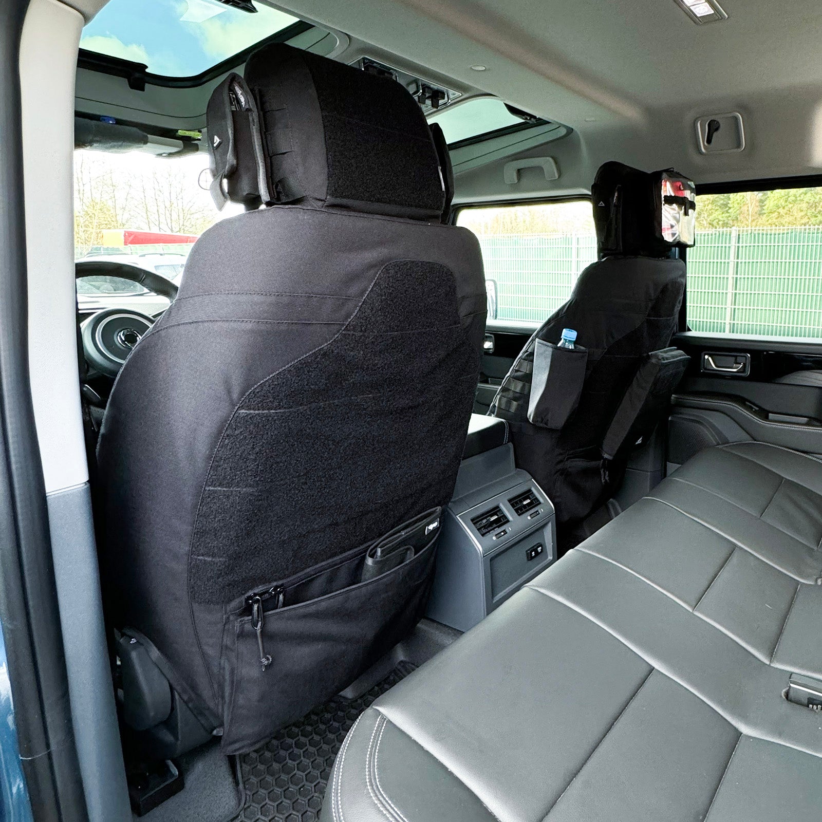 - Molle surfaces on the inside of the backrest and on the outside of the headrest Two additional pockets (one with zip) on the back of the backrest Each of our seat covers forms the entry ticket to our neat delta BAGS bag system via its fleece surfaces!